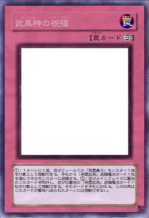 | ①:1ターンに1度、自分フィールドの「英霊勇士」モンスター1体を対象として発動できる。手札から「英霊武具」装備魔法カード1枚を選んでそのモンスターに装備する。②:自分メインフェイズに墓地のこのカードを除外し、自分の墓地の「英霊武具」装備魔法カード1枚を対象として発動できる。そのカードを手札に加える。この効果はこのカードが墓地へ送られたターンには発動できない。 | |||