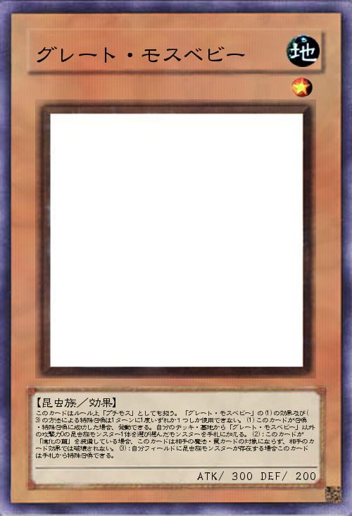 | このカードはルール上「プチモス」としても扱う。「グレート・モスベビー」の(1)の効果及び(3)の方法による特殊召喚は1ターンに1度いずれか1つしか使用できない。(1)このカードが召喚・特殊召喚に成功した場合、発動できる。自分のデッキ・墓地から「グレート・モスベビー」以外の攻撃力0の昆虫族モンスター1体を選び選んだモンスターを手札に加える。(2):このカードが「進化の繭」を装備している場合、このカードは相手の魔法・罠カードの対象にならず、相手のカード効果では破壊されない。(3):自分フィールドに昆虫族モンスターが存在する場合このカードは手札から特殊召喚できる。 | |||