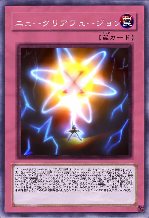 | 「ニュークリアフュージョン」の①②の効果は1ターンに1度、いずれか1つしか使用できない。①:自分が3000以上の効果ダメージを受けたターンのメインフェイズに発動できる。自分フィールドの「F・F」モンスター以外のモンスター及び相手フィールドのカードを全て破壊し、相手はこの効果で破壊したカードの数×200のダメージを受ける。その後、自分は相手が受けたダメージの半分の数値分のダメージを受ける。この発動に対して、相手は魔法・罠カードを発動できない。②:自分フィールドのレベル8以上の「F・F」Sモンスターが破壊された場合、墓地のこのカードを除外して発動できる。自分のエクストラデッキの表側表示の「F・F」Pモンスター1体を特殊召喚する。この効果で特殊召喚したモンスターはエンドフェイズに持ち主のデッキに戻る。 | |||