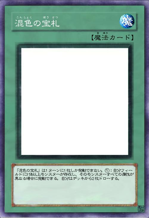 | 「混色の宝札」は1ターンに1枚しか発動できない。①:自分フィールドに3体以上モンスターが存在し、そのモンスターすべての属性が異なる場合に発動できる。自分はデッキから2枚ドローする。 | |||