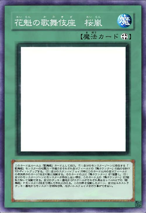| このカードはルール上「歌舞姫」カードとして扱う。(1):自分のモンスターゾーンに存在する「歌舞姫」モンスターの攻撃力・守備力をそれぞれ自分フィールドの「舞カウンター」の数の合計×100ポイントアップする。(2):自分のスタンバイフェイズ時にこのカード以外の自分フィールドの表側表示のカード1枚を対象に発動する。そのカードの上に「舞カウンター」を1個置く。(3):自分のモンスターゾーンにモンスターが存在しない場合、このカード上の「舞カウンター」を3個取り除いて発動できる。自分のデッキ・墓地からPスケールがそれぞれ異なるレベル4以下の「歌舞姫」Pモンスター2体まで選んで手札に加える。この効果を発動したターン、自分はエキストラデッキ・墓地からモンスターを特殊召喚、及びバトルフェイズを行う事ができない。 | |||