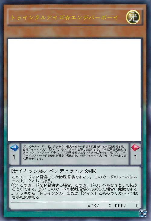 | このカードはP召喚でしか特殊召喚できない。このカードのレベルはルール上12として扱う。 ①:このカードをP召喚する場合、このカードのレベルを4として扱うことができる。②:このカードの特殊召喚に成功した場合に発動できる。デッキから「トゥインクル」または「アイズ」と名のつくカード1枚を手札に加える。 | |||
