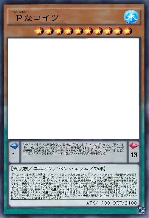 | このカードを用いたP召喚では、自分は「アイツ」「コイツ」「ソイツ」「ドイツ」「ヤツら」と名のついたモンスターしか特殊召喚できない。①Pゾーンのこのカードを破壊して発動できる。自分のデッキ・手札・墓地から「ソイツ」「ドイツ」と名のつくモンスターをそれぞれ1体ずつ自分フィールド上に特殊召喚する。 | |||