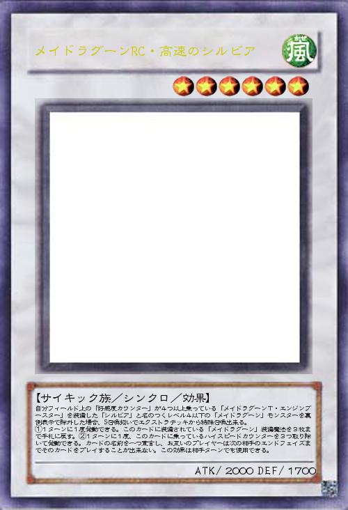 | 自分フィールド上の「好感度カウンター」が4つ以上乗っている「メイドラグーンT・エンジンブースター」を装備した「シルビア」と名のつくレベル4以下の「メイドラグーン」モンスターを裏側表示で除外した場合、S召喚扱いでエクストラデッキから特殊召喚出来る。 ①1ターンに1度発動できる。このカードに装備されている「メイドラグーン」装備魔法を3枚まで手札に戻す。②1ターンに1度、このカードに乗っているハイスピードカウンターを3つ取り除いて発動できる。カードの名前を一つ宣言し、お互いのプレイヤーは次の相手のエンドフェイズまでそのカードをプレイすることが出来ない。この効果は相手ターンでも使用できる。 | |||