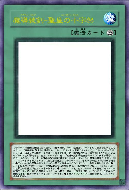 | このカードの発動は無効にされない。「魔導装剣」カードは自分フィールドに2枚までしか存在できない。「魔導装剣-聖皇の十字架」は1ターンに1枚しか発動できない。①:このカードが自分フィールドに存在する限り、このカードのコントローラーは攻撃力1500を得て自分バトルフェイズ中に1度攻撃できる。自分フィールドに他の「魔導装剣」永続魔法カードが存在する場合、このカードのコントローラーが得る攻撃力の数値は合計される(ダメージ計算は通常通り行う)。②:このカードが自分フィールドに存在する限り、このカードのコントローラーは以下の効果を得る。●フィールドの闇属性モンスターの攻撃力・守備力は500ダウンし、効果も無効になる。●1ターンに1度、相手モンスターの攻撃宣言時に発動できる。その攻撃を無効にし、そのモンスターの攻撃力の数値だけ自分LPを回復する。●1ターンに1度、自分フィールド・墓地にモンスターが存在し | |||