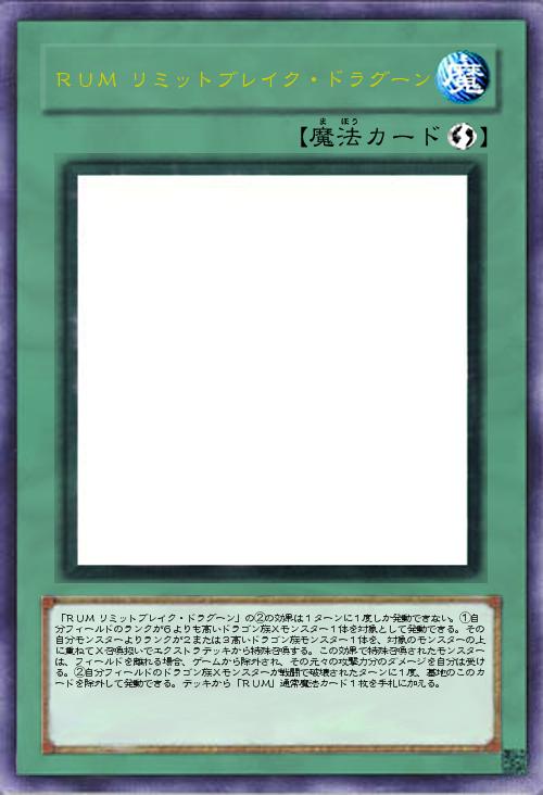 | 「RUM リミットブレイク・ドラグーン」の②の効果は1ターンに1度しか発動できない。①自分フィールドのランクが6よりも高いドラゴン族Xモンスター1体を対象として発動できる。その自分モンスターよりランクが2または3高いドラゴン族モンスター1体を、対象のモンスターの上に重ねてX召喚扱いでエクストラデッキから特殊召喚する。この効果で特殊召喚されたモンスターは、フィールドを離れる場合、ゲームから除外され、その元々の攻撃力分のダメージを自分は受ける。②自分フィールドのドラゴン族Xモンスターが戦闘で破壊されたターンに1度、墓地のこのカードを除外して発動できる。デッキから「RUM」通常魔法カード1枚を手札に加える。 | |||