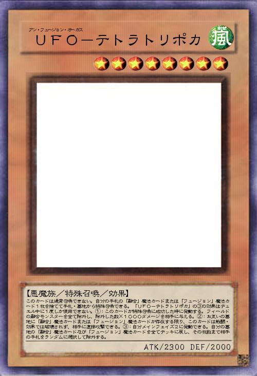 | このカードは通常召喚できない。自分の手札の「融合」魔法カードまたは「フュージョン」魔法カード1枚を捨てて手札・墓地から特殊召喚できる。「UFO-テトラトリポカ」の③の効果はデュエル中に1度しか使用できない。①:このカードが特殊召喚に成功した時に発動する。フィールドの融合モンスターを全て除外し、除外した数×1000ダメージを相手に与える。②:お互いの墓地に「融合」魔法カードまたは「フュージョン」魔法カードが存在する限り、このカードは戦闘・効果では破壊されず、相手に直接攻撃できる。③:自分メインフェイズ2に発動できる。自分の墓地の「融合」魔法カード及び「フュージョン」魔法カードを全てデッキに戻し、その枚数まで相手の手札をランダムに選択して除外する。 | |||