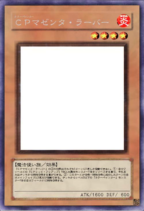 | 「CPマゼンタ・ラーバー」の②の効果はそれぞれ1ターンに1度しか発動できない。①:自分フィールドの「CPレッド・フレアップ」1体と水属性モンスター1体をリリースする事で、手札またはデッキから特殊召喚する事ができる。②:このカードが召喚・特殊召喚に成功したターンの自分メインフェイズに1度だけ発動できる。デッキからレベル3以下の「カラーペインター」モンスター1体を自分フィールドに特殊召喚する。 | |||