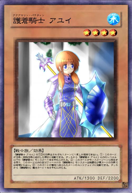 | 「護蒼騎士 アユイ」の①③の効果はそれぞれ1ターンに1度しか使用できない。①:このカードが召喚・特殊召喚に成功した場合に発動できる。デッキから「護蒼騎士 アユイ」以外のレベル4以下の「護蒼騎士」モンスター1体を手札に加える。②:このカードがモンスターゾーンに存在する限り、このカード以外の自分フィールドの「護蒼騎士」モンスターは戦闘及び罠カードの効果では破壊されない。③:このカードが墓地へ送られたターンのエンドフェイズに発動できる。デッキから「護蒼騎士」魔法カード1枚を手札に加える。 | |||