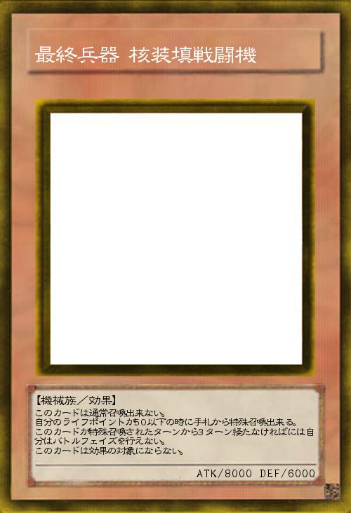 | このカードは通常召喚出来ない。 自分のライフポイントが50以下の時に手札から特殊召喚出来る。 このカードが特殊召喚されたターンから3ターン経たなければには自分はバトルフェイズを行えない。 このカードは効果の対象にならない。 | |||
