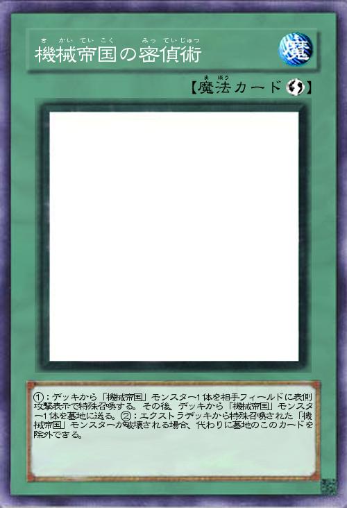 | ①:デッキから「機械帝国」モンスター1体を相手フィールドに表側攻撃表示で特殊召喚する。その後、デッキから「機械帝国」モンスター1体を墓地に送る。②:エクストラデッキから特殊召喚された「機械帝国」モンスターが破壊される場合、代わりに墓地のこのカードを除外できる。 | |||