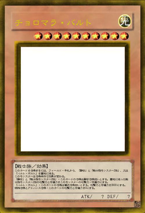 | このカードを召喚するには、フィールド・手札から、「融合」と「戦士族モンスター2体」、又は「バルト・ボルト」を墓地に送る。 このモンスターは召喚条件で効果が変わる。 「融合」と「戦士族モンスター2体」・このカードの召喚は融合召喚扱いとする。墓地に送った戦士族モンスター2体の攻撃力と守備力をこのモンスターの攻撃力・守備力にする。 「バルト・ボルト」・このカードの召喚は儀式召喚扱いとする。攻撃力と守備力を3000にする。 特殊召喚とアドバンス召喚・このカードの攻撃力と守備力を0にする。 | |||