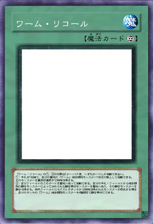 | 「ワーム・リコール」の①、②の効果は1ターンに1度、いずれか一つしか発動できない。 ①:手札を1枚捨て、自分の墓地の「ワーム」爬虫類族モンスター1体を対象として発動できる。そのモンスターを裏側守備表示で特殊召喚する。 ②:自分フィールドのこのカードを墓地へ送って発動できる。自分の手札・フィールドから爬虫類族の融合モンスターによって決められた融合素材モンスターを墓地へ送り、その融合モンスターを融合召喚する。相手フィールドにエクストラデッキから特殊召喚されたモンスターが存在する場合、自分のデッキの「ワーム」爬虫類族モンスターも4種類まで融合素材にできる。 | |||