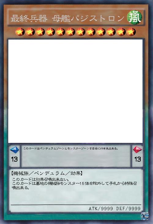 | このカードは効果召喚出来ない。 このカードは墓地の機械族モンスター15体を除外して手札から特殊召喚出来る。 | |||