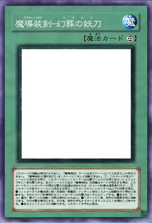 | このカードの発動は無効にされない。「魔導装剣」カードは自分フィールドに2枚までしか存在できない。「魔導装剣-幻葬の妖刀」は1ターンに1枚しか発動できない。①:このカードが自分フィールドに存在する限り、このカードのコントローラーは攻撃力1400を得て自分バトルフェイズ中に1度攻撃できる。自分フィールドに他の「魔導装剣」永続魔法カードが存在する場合、このカードのコントローラーが得る攻撃力の数値は合計される(ダメージ計算は通常通り行う)。②:このカードが自分フィールドに存在する限り、このカードのコントローラーは以下の効果を得る。●コントローラーが魔法使い族・天使族・悪魔族・アンデット族モンスターと戦闘を行う場合に発動する。そのダメージ計算時のみコントローラーの攻撃力は1500アップする。●自分の「D・A」魔法・罠カードの発動・効果は無効にされない。●1ターンに1度、相手の攻撃宣言時に発動できる。 | |||
