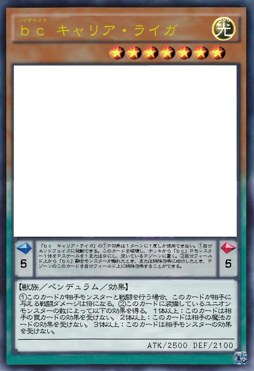 | 「bc キャリア・ライガ」の①P効果は1ターンに1度しか使用できない。①自分エンドフェイズに発動できる。このカードを破壊し、デッキから「bc」Pモンスター1体をPスケールを1または9にし、空いているPゾーンに置く。②自分フィールド上から「bc」融合モンスターが離れたとき、または特殊召喚に成功したとき、Pゾーンのこのカードを自分フィールド上に特殊召喚することができる。 | |||