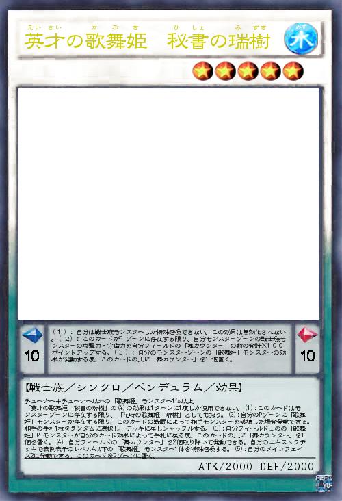 | チューナー+チューナー以外の「歌舞姫」モンスター1体以上 「英才の歌舞姫 秘書の瑞樹」の(4)の効果は1ターンに1度しか使用できない。(1):このカードはモンスターゾーンに存在する限り、「花時の歌舞姫 瑞樹」としても扱う。(2):自分のPゾーンに「歌舞姫」モンスターが存在する限り、このカードの戦闘によって相手モンスターを破壊した場合発動できる。相手の手札1枚をランダムに選択し、デッキに戻しシャッフルする。(3):自分フィールド上のの「歌舞姫」P モンスターが自分のカード効果によって手札に戻る度、このカードの上に「舞カウンター」を1個を置く。(4):自分フィールドの「舞カウンター」を2個取り除いて発動できる。自分のエキストラデッキで表側表示のレベル4以下の「歌舞姫」モンスター1体を特殊召喚する。(5):自分のメインフェイズ2に発動できる。このカードをPゾーンに置く。 | |||