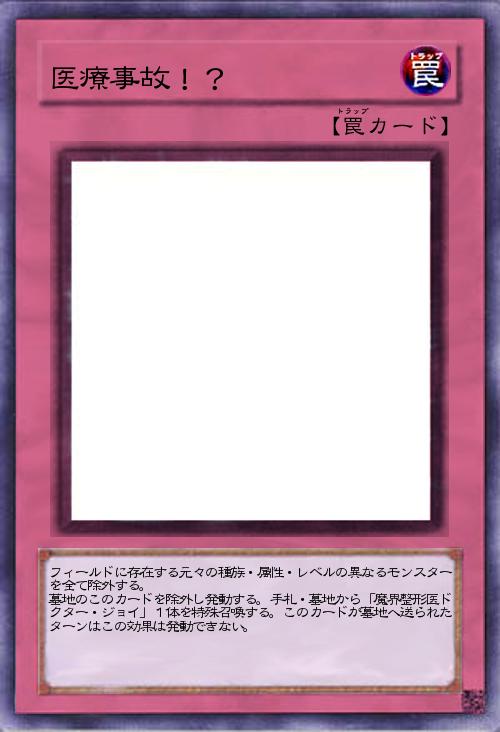 | フィールドに存在する元々の種族・属性・レベルの異なるモンスターを全て除外する。 墓地のこのカードを除外し発動する。手札・墓地から「魔界整形医ドクター・ジョイ」1体を特殊召喚する。このカードが墓地へ送られたターンはこの効果は発動できない。 | |||