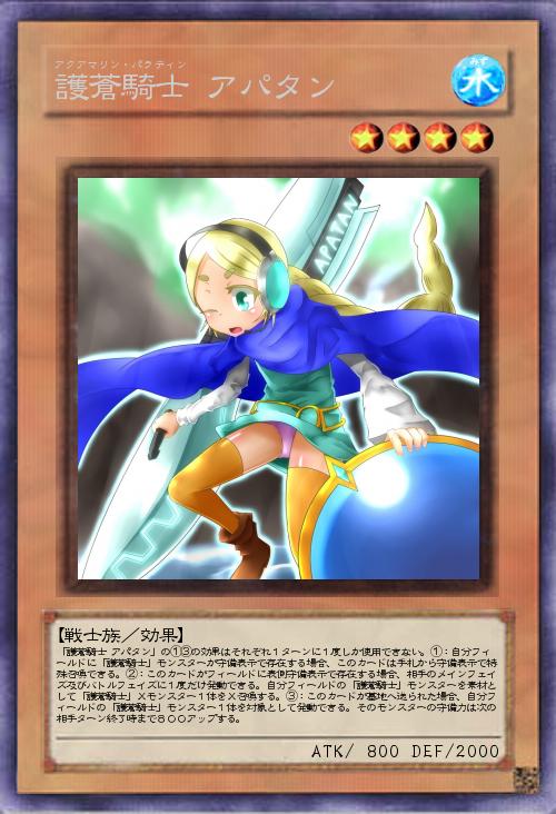 | 「護蒼騎士 アパタン」の①③の効果はそれぞれ1ターンに1度しか使用できない。①:自分フィールドに「護蒼騎士」モンスターが守備表示で存在する場合、このカードは手札から守備表示で特殊召喚できる。②:このカードがフィールドに表側守備表示で存在する場合、相手のメインフェイズ及びバトルフェイズに1度だけ発動できる。自分フィールドの「護蒼騎士」モンスターを素材として「護蒼騎士」Xモンスター1体をX召喚する。③:このカードが墓地へ送られた場合、自分フィールドの「護蒼騎士」モンスター1体を対象として発動できる。そのモンスターの守備力は次の相手ターン終了時まで800アップする。 | |||