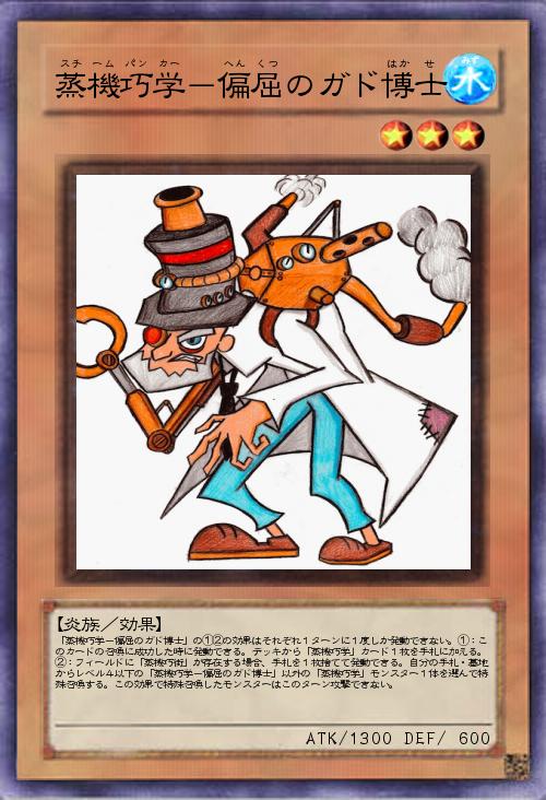 | 「蒸機巧学-偏屈のガド博士」の①②の効果はそれぞれ1ターンに1度しか発動できない。①:このカードの召喚に成功した時に発動できる。デッキから「蒸機巧学」カード1枚を手札に加える。②:フィールドに「蒸機巧街」が存在する場合、手札を1枚捨てて発動できる。自分の手札・墓地からレベル4以下の「蒸機巧学-偏屈のガド博士」以外の「蒸機巧学」モンスター1体を選んで特殊召喚する。この効果で特殊召喚したモンスターはこのターン攻撃できない。 | |||