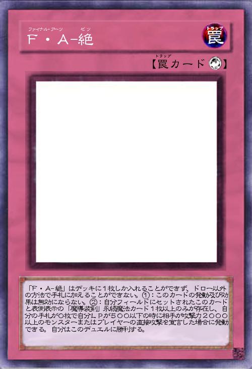 | 「F・A-絶」はデッキに1枚しか入れることができず、ドロー以外の方法で手札に加えることができない。①:このカードの発動及び効果は無効にならない。②:自分フィールドにセットされたこのカードと表側表示の「魔導装剣」永続魔法カード1枚以上のみが存在し、自分の手札が0枚で自分LPが500以下の時に相手が攻撃力2000以上のモンスターまたはプレイヤーの直接攻撃を宣言した場合に発動できる。自分はこのデュエルに勝利する。 | |||