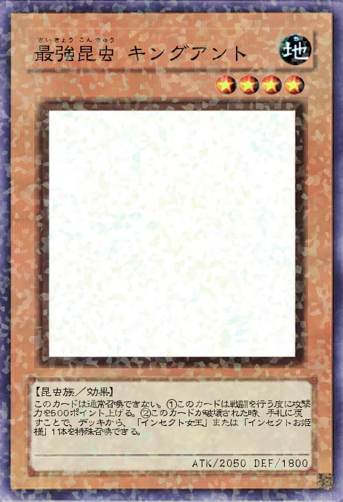 | このカードは通常召喚できない。①このカードは戦闘を行う度に攻撃力を500ポイント上げる。②このカードが破壊された時、手札に戻すことで、デッキから、「インセクト女王」または「インセクトお姫様」1体を特殊召喚できる。 | |||