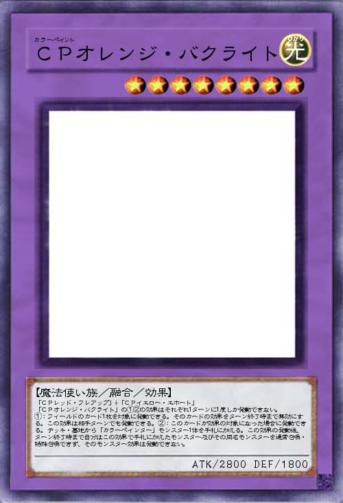 | 「CPレッド・フレアップ」+「CPイエロー・エホート」 「CPオレンジ・バクライト」の①②の効果はそれぞれ1ターンに1度しか発動できない。 ①:フィールドのカード1枚を対象に発動できる。そのカードの効果をターン終了時まで無効にする。この効果は相手ターンでも発動できる。②:このカードが効果の対象になった場合に発動できる。デッキ・墓地から「カラーペインター」モンスター1体を手札に加える。この効果の発動後、ターン終了時まで自分はこの効果で手札に加えたモンスター及びその同名モンスターを通常召喚・特殊召喚できず、そのモンスター効果は発動できない。 | |||