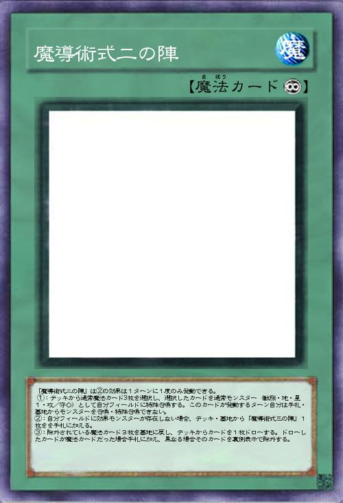 | 「魔導術式二の陣」は②の効果は1ターンに1度のみ発動できる。 ①:デッキから通常魔法カード3枚を選択し、選択したカードを通常モンスター(獣族・地・星1・攻/守0)として自分フィールドに特殊召喚する。このカードが発動するターン自分は手札・墓地からモンスターを召喚・特殊召喚できない。 ②:自分フィールドに効果モンスターが存在しない場合、デッキ・墓地から「魔導術式三の陣」1枚をを手札に加える。 ③:除外されている魔法カード3枚を墓地に戻し、デッキからカードを1枚ドローする。ドローしたカードが魔法カードだった場合手札に加え、異なる場合そのカードを裏側表示で除外する。 | |||