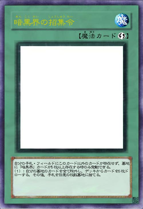 | 自分の手札・フィールドにこのカード以外のカードが存在せず、墓地に「暗黒界」カードが5枚以上存在する時のみ発動できる。 (1):自分の墓地のカードを全て除外し、デッキからカードを5枚ドローする。その後、手札を任意の枚数墓地に捨てる。 | |||