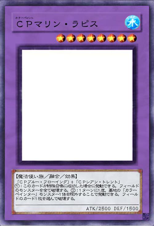 | 「CPブルー・フローイング」+「CPシアン・トレント」 ①:このカードが特殊召喚に成功した場合に発動できる。フィールドのモンスターを全て破壊する。②:1ターンに1度、墓地の「カラーペインター」モンスター1体を除外することで発動できる。フィールドのカード1枚を選んで破壊する。 | |||