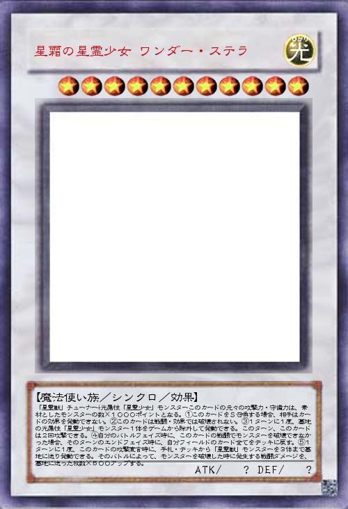 | 「星霊獣」チューナー+光属性「星霊少女」モンスターこのカードの元々の攻撃力・守備力は、素材としたモンスターの数×1000ポイントとなる。①このカードをS召喚する場合、相手はカードの効果を発動できない。②このカードは戦闘・効果では破壊されない。③1ターンに1度、墓地の光属性「星霊少女」モンスター1体をゲームから除外して発動できる。このターン、このカードは2回攻撃できる。④自分のバトルフェイズ時に、このカードの戦闘でモンスターを破壊できなかった場合、そのターンのエンドフェイズ時に、自分フィールドのカード全てをデッキに戻す。⑤1ターンに1度、このカードの攻撃宣言時に、手札・デッキから「星霊獣」モンスターを3体まで墓地に送り発動できる。そのバトルによって、モンスターを破壊した時に発生する戦闘ダメージを、墓地に送った枚数×500アップする。 | |||