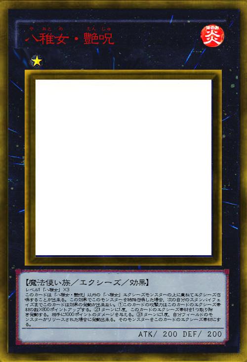| レベル1「八稚女」×3 このカードは「八稚女・艶呪」以外の「八稚女」エクシーズモンスターの上に重ねてエクシーズ召喚することが出来る。この効果でこのモンスターを特殊召喚した場合、次の自分のスタンバイフェイズまでこのカードは効果の発動が出来ない。①このカードの攻撃力はこのカードのエクシーズ素材の数×800ポイントアップする。②1ターンに1度、このカードのエクシーズ素材を1つ取り除き発動する。相手に1000ポイントのダメージを与える。③1ターンに1度、自分フィールドのモンスターがリリースされた場合に発動出来る。そのモンスターをこのカードのエクシーズ素材にする。 | |||