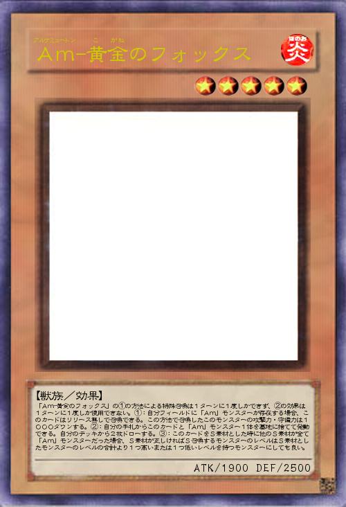 | 「Am-黄金のフォックス」の①の方法による特殊召喚は1ターンに1度しかできず、②の効果は1ターンに1度しか使用できない。①:自分フィールドに「Am」モンスターが存在する場合、このカードはリリース無しで召喚できる。この方法で召喚したこのモンスターの攻撃力・守備力は1000ダウンする。②:自分の手札からこのカードと「Am」モンスター1体を墓地に捨てて発動できる。自分のデッキから2枚ドローする。③:このカードをS素材とした時に他のS素材が全て「Am」モンスターだった場合、S素材が正しければS召喚するモンスターのレベルはS素材としたモンスターのレベルの合計より1つ高いまたは1つ低いレベルを持つモンスターにしても良い。 | |||