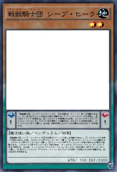 | 「戦獣騎士団 シープ・ヒーラー」の③の効果は1ターンに1度しか発動できない。①:このカードが召喚・P召喚に成功した時、このカードにMPカウンターを1つ置く。②:自分スタンバイフェイズに発動する。このカードにMPカウンターを1つ置く。③:フィールドのMPカウンんふターが取り除かれた場合に発動できる。このカードのMPカウンターを1つ取り除き、デッキから「アニマル・ナイツ」モンスター1体を召喚する。その後、フィールドの「アニマル・ナイツ」モンスター1体を選んでMPカウンターを1つ置く。④:自分フィールドに「アニマル・ナイツ」モンスターが召喚・P召喚された時に発動する。自分は500LP回復する。 | |||