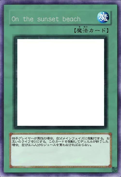 | 相手プレイヤーが異性の場合、自分メインフェイズに発動できる。お互いのライフを0にする。このカードを発動してデュエルが終了した場合、自分は二人分のジュースを買わなければならない。 | |||