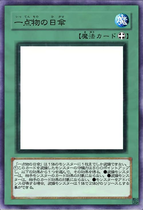 | 「一点物の日傘」は1体のモンスターに1枚までしか装備できない。①このカードを装備したモンスターの守備力は500ポイントアップし、以下の効果から1つを選んで、その効果を得る。●装備モンスターは、相手モンスターのカード効果の対象にならない。●装備モンスターは、相手のカード効果の対象にならない。●モンスターをアドバンス召喚する場合、装備モンスターは1体で2体分のリリースとする事ができる。 | |||