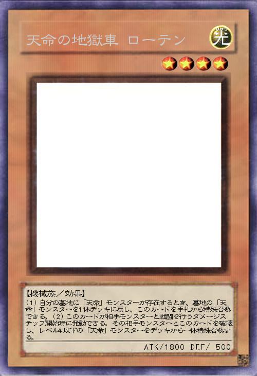 | (1)自分の墓地に「天命」モンスターが存在するとき、墓地の「天命」モンスターを1体デッキに戻し、このカードを手札から特殊召喚できる。(2)このカードが相手モンスターと戦闘を行うダメージステップ開始時に発動できる。その相手モンスターとこのカードを破壊し、レベル4以下の「天命」モンスターをデッキから一体特殊召喚する。 | |||