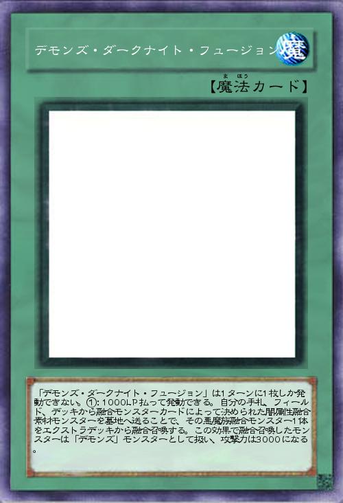 | 「デモンズ・ダークナイト・フュージョン」は1ターンに1枚しか発動できない。①:1000LP払って発動できる。自分の手札、フィールド、デッキから融合モンスターカードによって決められた闇属性融合素材モンスターを墓地へ送ることで、その悪魔族融合モンスター1体をエクストラデッキから融合召喚する。この効果で融合召喚したモンスターは「デモンズ」モンスターとして扱い、攻撃力は3000になる。 | |||