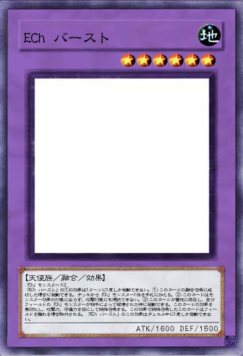 | 「Ch」モンスター×2 「ECh バースト」の①の効果は1ターンに1度しか発動できない。①:このカードの融合召喚に成功した場合に発動できる。デッキから「Ch」モンスター1体を手札に加える。②:このカードはモンスター効果の対象にならず、攻撃対象にも選択できない。③:このカードが墓地に存在し、自分フィールドの「Ch」モンスターが相手によって破壊された時に発動できる。このカードの効果を無効化し、攻撃力、守備力を倍にして特殊召喚する。この効果で特殊召喚したこのカードはフィールドを離れる場合除外される。「ECh バースト」のこの効果はデュエル中に1度しか発動できない。 | |||