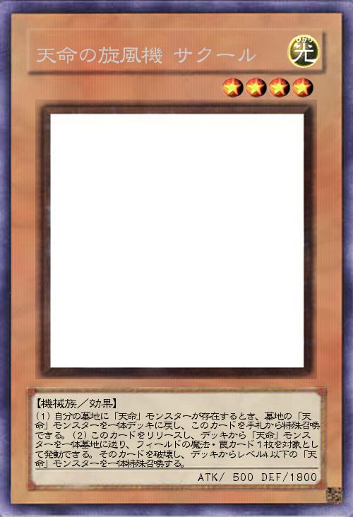 | (1)自分の墓地に「天命」モンスターが存在するとき、墓地の「天命」モンスターを一体デッキに戻し、このカードを手札から特殊召喚できる。(2)このカードをリリースし、デッキから「天命」モンスターを一体墓地に送り、フィールドの魔法・罠カード1枚を対象として発動できる。そのカードを破壊し、デッキからレベル4以下の「天命」モンスターを一体特殊召喚する。 | |||