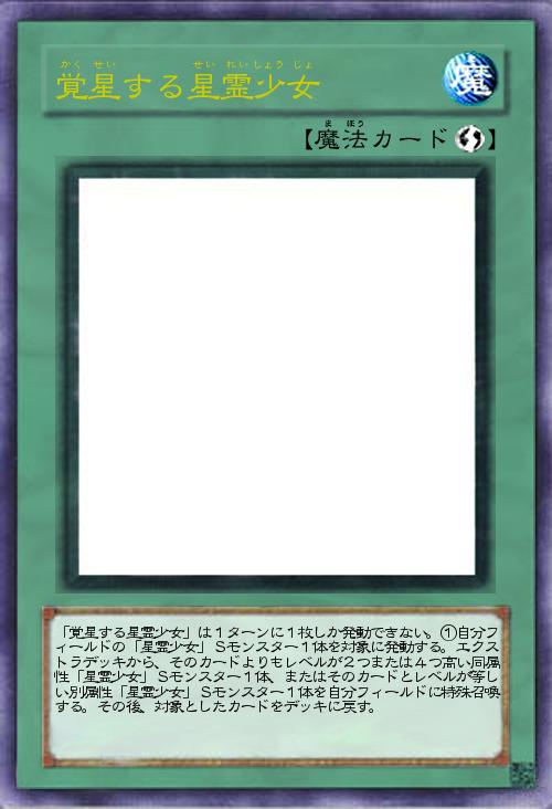 | 「覚星する星霊少女」は1ターンに1枚しか発動できない。①自分フィールドの「星霊少女」Sモンスター1体を対象に発動する。エクストラデッキから、そのカードよりもレベルが2つまたは4つ高い同属性「星霊少女」Sモンスター1体、またはそのカードとレベルが等しい別属性「星霊少女」Sモンスター1体を自分フィールドに特殊召喚する。その後、対象としたカードをデッキに戻す。 | |||