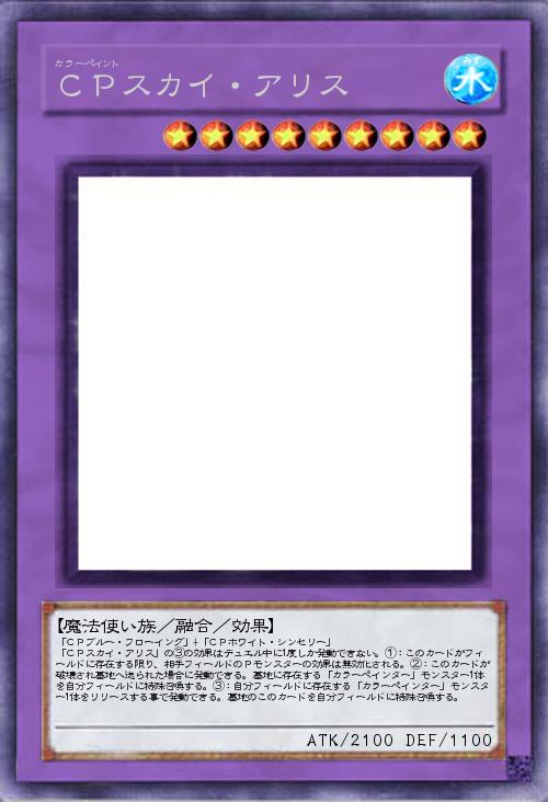 | 「CPブルー・フローイング」+「CPホワイト・シンセリー」 「CPスカイ・アリス」の③の効果はデュエル中に1度しか発動できない。①:このカードがフィールドに存在する限り、相手フィールドのPモンスターの効果は無効化される。②:このカードが破壊され墓地へ送られた場合に発動できる。墓地に存在する「カラーペインター」モンスター1体を自分フィールドに特殊召喚する。③:自分フィールドに存在する「カラーペインター」モンスター1体をリリースする事で発動できる。墓地のこのカードを自分フィールドに特殊召喚する。 | |||
