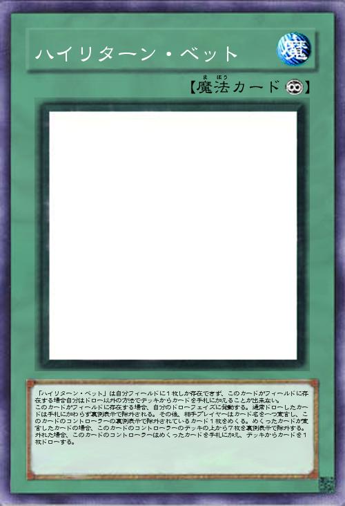 | 「ハイリターン・ベット」は自分フィールドに1枚しか存在できず、このカードがフィールドに存在する場合自分はドロー以外の方法でデッキからカードを手札に加えることが出来ない。 このカードがフィールドに存在する場合、自分のドローフェイズに発動する。通常ドローしたカードは手札に加わらず裏側表示で除外される。その後、相手プレイヤーはカード名を一つ宣言し、このカードのコントローラーの裏側表示で除外されているカード1枚をめくる。めくったカードが宣言したカードの場合、このカードのコントローラーのデッキの上から7枚を裏側表示で除外する。外れた場合、このカードのコントローラーはめくったカードを手札に加え、デッキからカードを1枚ドローする。 | |||