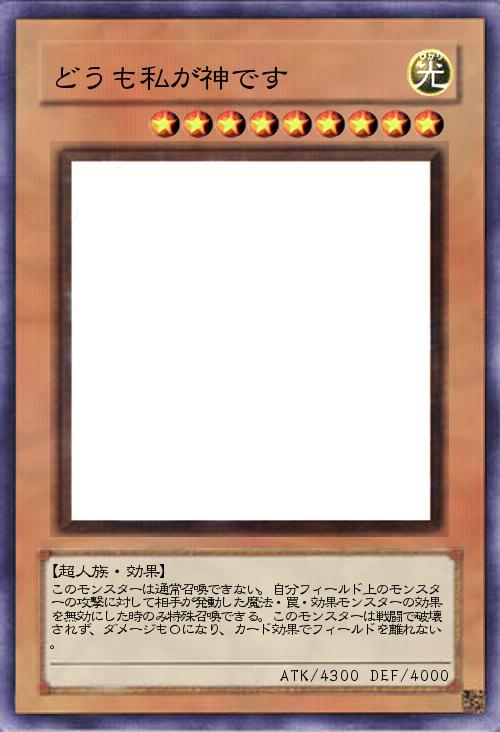 | このモンスターは通常召喚できない。自分フィールド上のモンスターの攻撃に対して相手が発動した魔法・罠・効果モンスターの効果を無効にした時のみ特殊召喚できる。このモンスターは戦闘で破壊されず、ダメージも0になり、カード効果でフィールドを離れない。 | |||