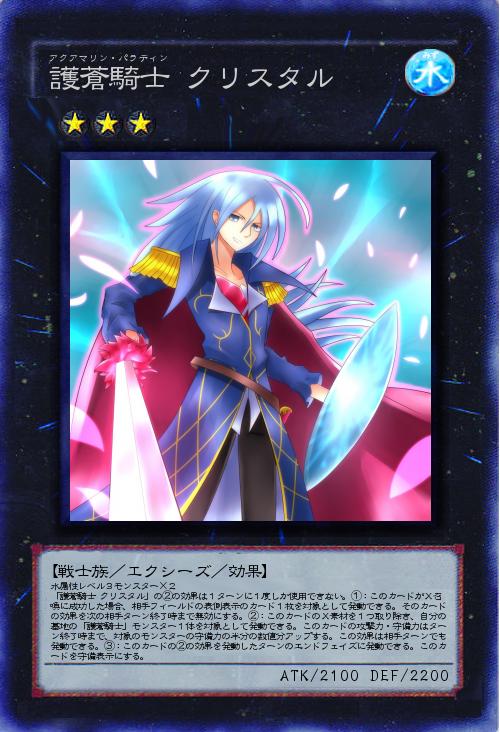 | 水属性レベル3モンスター×2 「護蒼騎士 クリスタル」の②の効果は1ターンに1度しか使用できない。①:このカードがX召喚に成功した場合、相手フィールドの表側表示のカード1枚を対象として発動できる。そのカードの効果を次の相手ターン終了時まで無効にする。②:このカードのX素材を1つ取り除き、自分の墓地の「護蒼騎士」モンスター1体を対象として発動できる。このカードの攻撃力・守備力はターン終了時まで、対象のモンスターの守備力の半分の数値分アップする。この効果は相手ターンでも発動できる。③:このカードの②の効果を発動したターンのエンドフェイズに発動できる。このカードを守備表示にする。 | |||