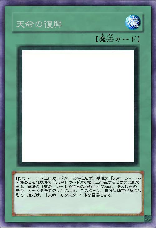 | 自分フィールド上にカードが一切存在せず、墓地に「天命」フィールド魔法とそれ以外の「天命」カードが6枚以上存在するときに発動できる。墓地の「天命」カードを任意の枚数手札に加え、それ以外の「天命」カードを全てデッキに戻す。このターン、自分は通常召喚に加えて一度だけ、「天命」モンスター1体を召喚できる。 | |||