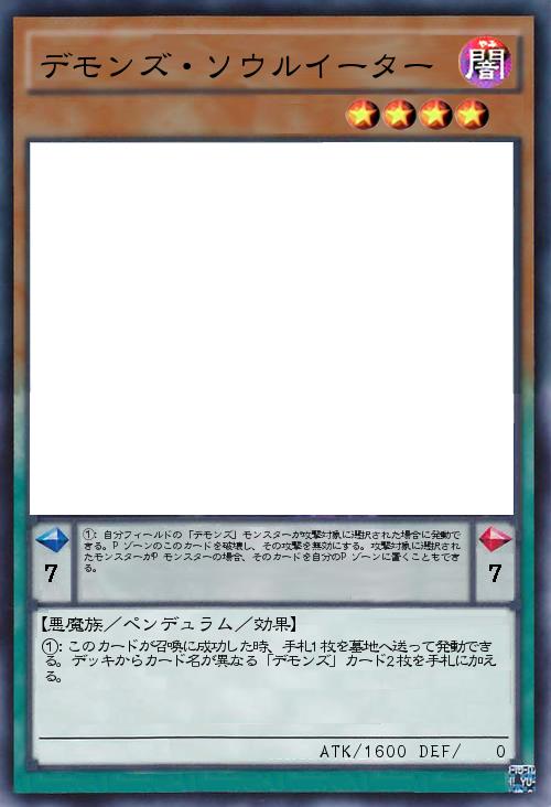 「万能サーチ要因の「デモンズ」Pモンスターです。「あれ?モンスターでサーチできるヤツいなくね?」と思い、作りました。レベル4であるため、とても使いやすい1枚です。