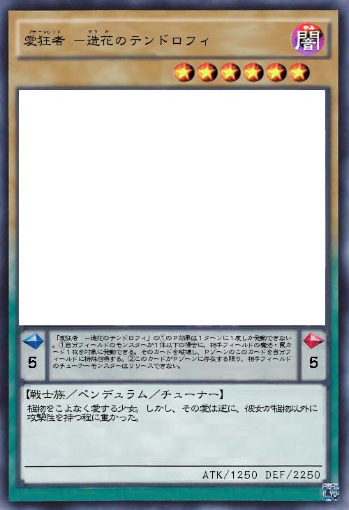 | 「愛狂者 -造花のテンドロフィ」の①のP効果は1ターンに1度しか発動できない。①自分フィールドのモンスターが1体以下の場合に、相手フィールドの魔法・罠カード1枚を対象に発動できる。そのカードを破壊し、Pゾーンのこのカードを自分フィールドに特殊召喚する。②このカードがPゾーンに存在する限り、相手フィールドのチューナーモンスターはリリースできない。 | |||