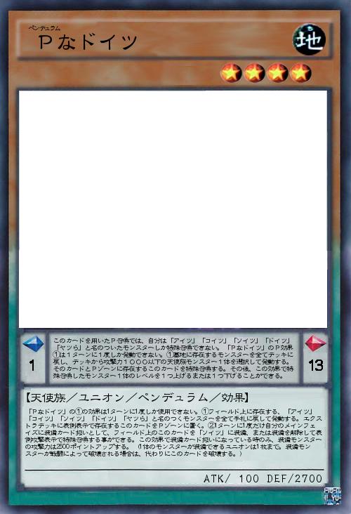 | このカードを用いたP召喚では、自分は「アイツ」「コイツ」「ソイツ」「ドイツ」「ヤツら」と名のついたモンスターしか特殊召喚できない。「Pなドイツ」のP効果①は1ターンに1度しか発動できない。①墓地に存在するモンスターを全てデッキに戻し、デッキから攻撃力1000以下の天使族モンスター1体を選択して発動する。そのカードとPゾーンに存在するこのカードを特殊召喚する。その後、この効果で特殊召喚したモンスター1体のレベルを1つ上げるまたは1つ下げることができる。 | |||