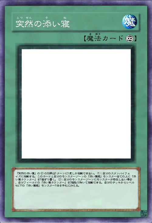 | 「突然の添い寝」の(2)の効果は1ターンに1度しか発動できない。(1):自分のスタンバイフェイズに発動する。このカードと自分のモンスターゾーンの「添い寝姫」モンスター全ての上に「添い寝カウンター」を1個ずつ置く。(2):自分のモンスターゾーンにモンスターが存在しない場合、自分フィールドの「添い寝カウンター」を3個取り除いて発動できる。自分のデッキからレベル4以下の「添い寝姫」モンスター1体を手札に加える。 | |||